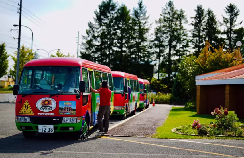 登降園時にはたくさんの園バスが運行します。降車後にバス内に子どもが残っていないかきちんと確認するとともに、置き去り防止ブザーと、人の姿を探知するAIカメラを設置することで安全を管理しています。