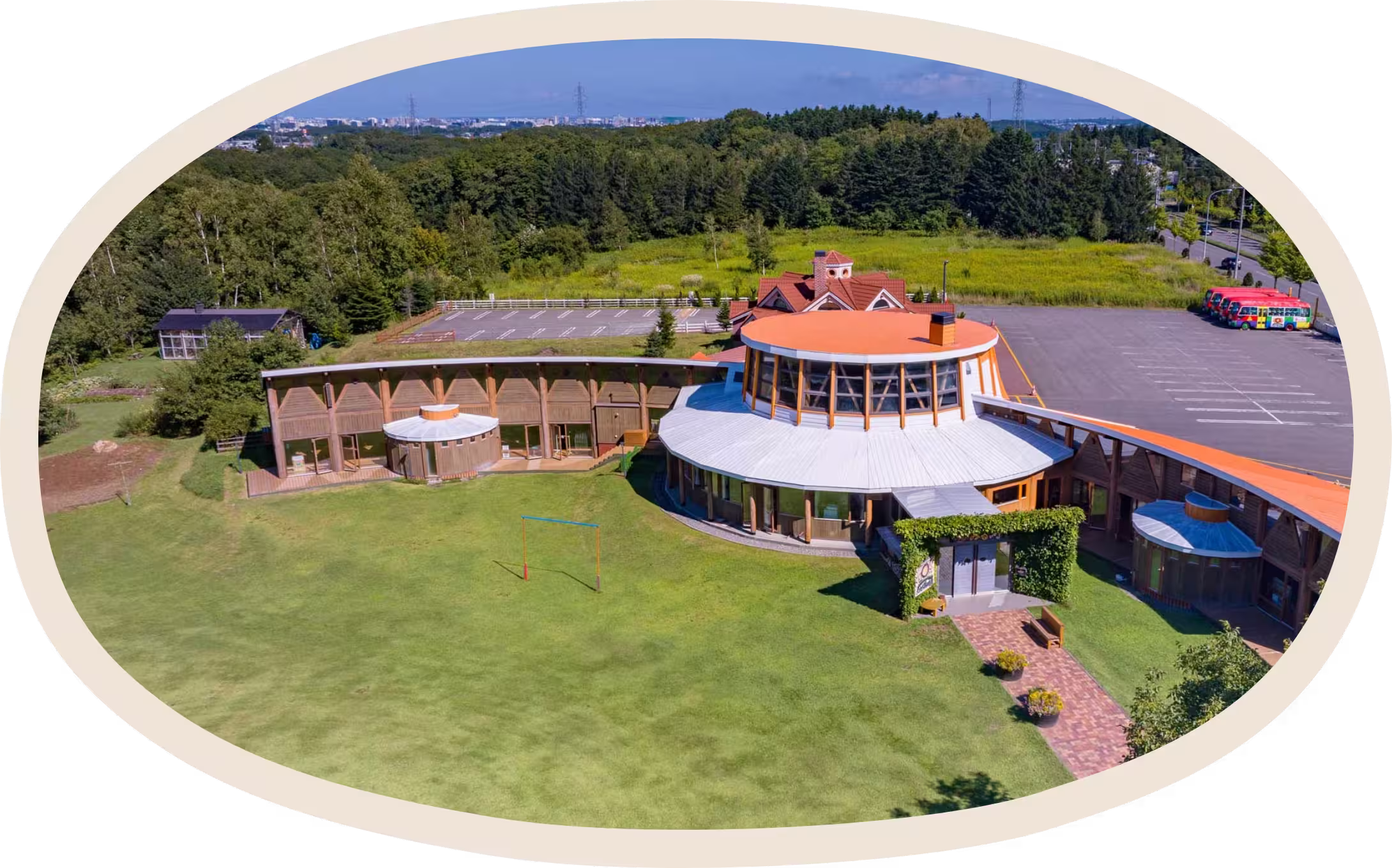 原生の森と牧草が広がるこの土地は、海抜83mと太陽に近く風の通る心地良い場所です。園の創立者である坂本理事長は、子どもたちが自然の中でのびのびと過ごせる理想の土地を求め各地を見て歩き、この場所に出合いました。